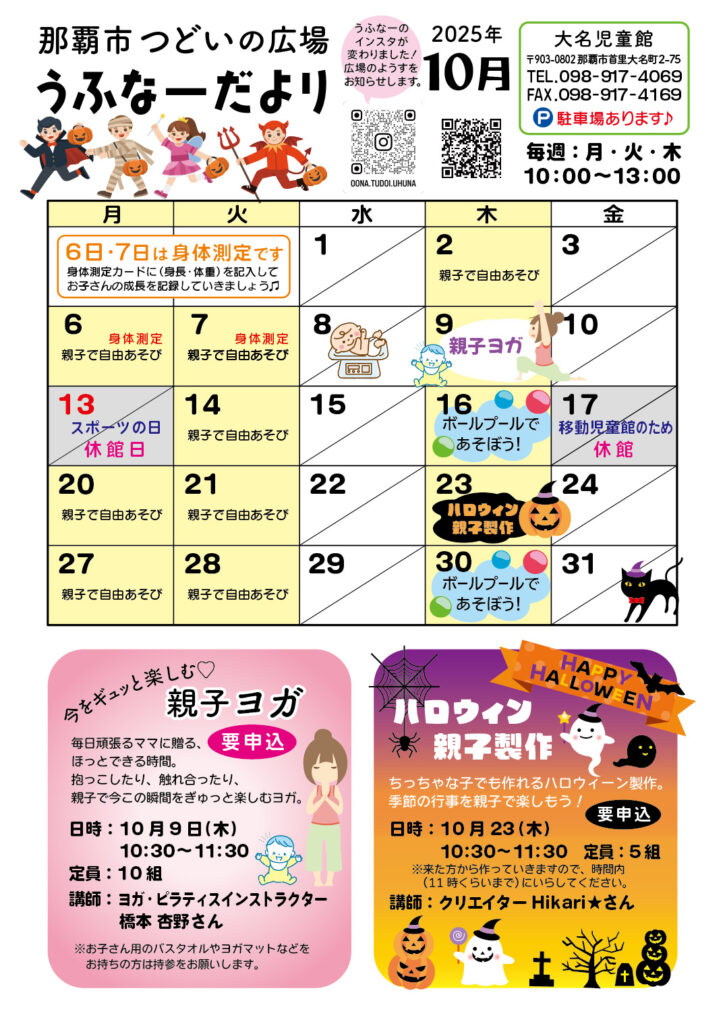 大名児童館つどいの広場では、講座として「親子ヨガ」、「ハロウィン🎃親子製作」をおこないます。